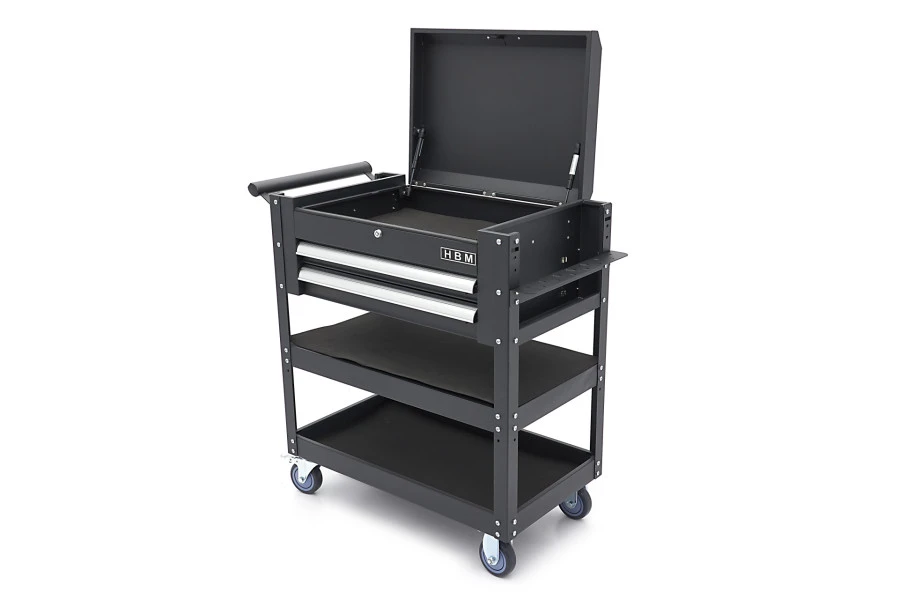 Een opgeruimde werkplaats of garage is te realiseren met deze HBM 2 Laden Gereedschapswagen Met 2 Plateaus en Opbergvak. Al je gereedschap netjes opgeborgen in deze solide en stevige gereedschapswagen,