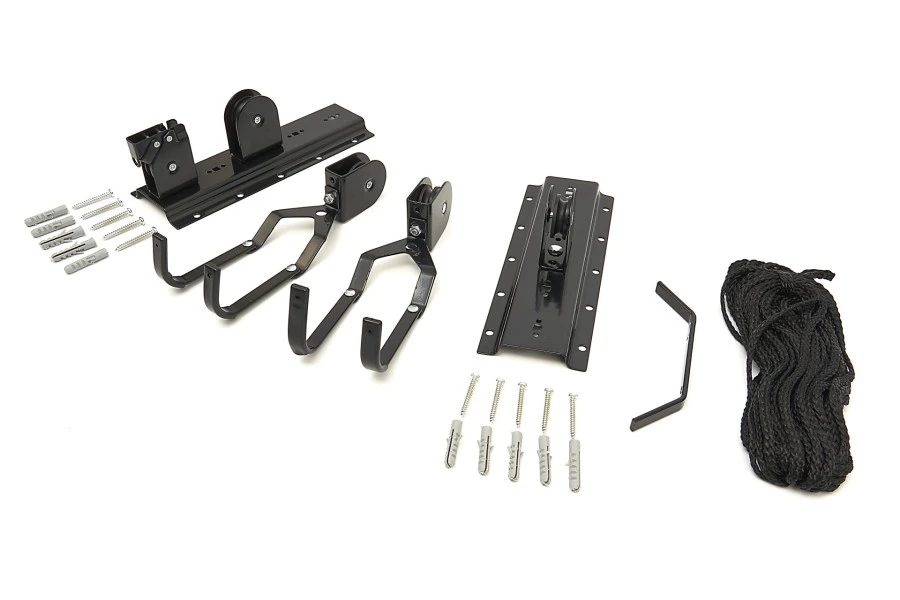 Het meegeleverde Nylon koord loopt soepel door de katrollen heen, maar als je de spanning van het koord laat wegvallen, wordt het koord automatisch geblokkeerd, waardoor de fiets veilig blijft hangen. Met een klein rukje aan het koord, is de blokkade weer opgeheven en kan je de fiets weer langzaam naar beneden laten zakken.