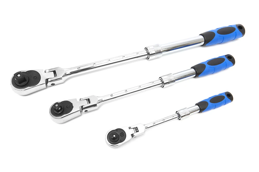 Deze HBM 3 Delige Professionele Uitschuifbare Ratelset Met Kantelbare Koppenset bevat 3 verlengbare ratelsocket moersleutel drive (1/4″, 1/2″, 3/8″) van hoge kwaliteit. Tevens kunnen de handgrepen verlengd worden voor een langer bereik en verhoogde torque.