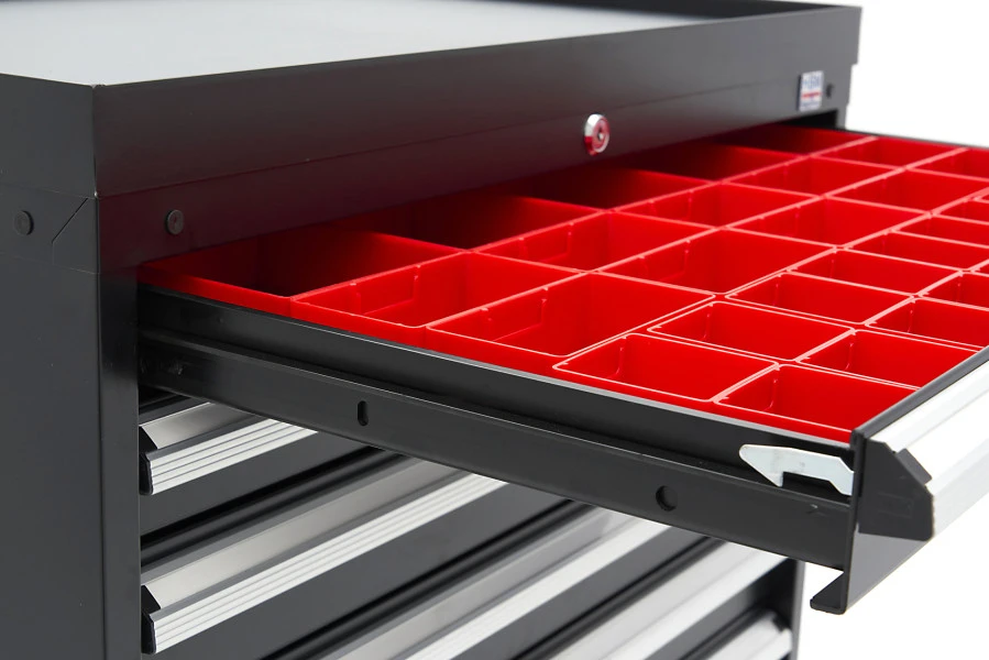 Met deze HBM gereedschapskast met bakjes en tussenschotten haal je topkwaliteit in huis. De kast wordt zowel ingezet in mechanische als elektronische werkplaatsen en voor gereedschappen en kleine onderdelen. Door de stevige uitvoering kan de kast ook tegen een stootje. Alle laden zijn voorzien van een lift-up slot. Daarnaast heeft de kast een centraal slot, waarmee aan het eind van de dag alle laden worden afgesloten. De gereedschapskast heeft een werkblad met opstaande rand.