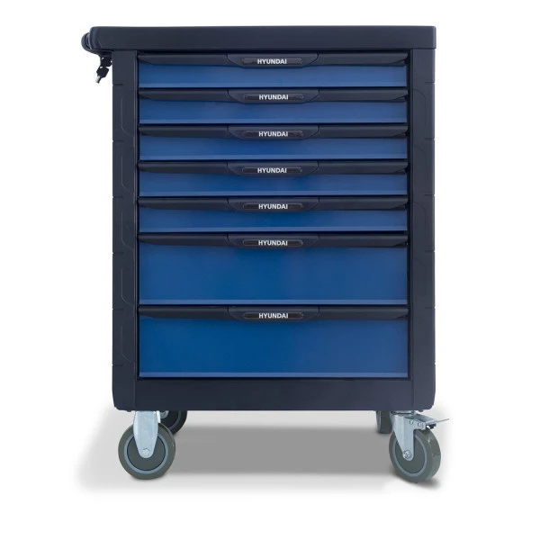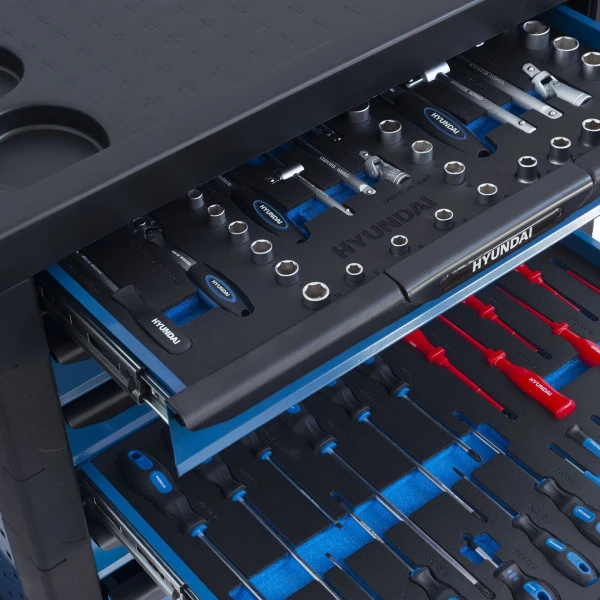 Met deze 175-delige gereedschapswagen met inhoud van Hyundai heb je alle klusspullen overzichtelijk bij de hand. Deze is compleet gevuld met alle soorten klein gereedschap die je nodig hebt.. Uitgerust met maar liefst zeven lades, waarvan vijf volledig gevuld. Deze gereedschapswagen biedt heel veel gereedschap op vijf prettige zwenkwielen waarmee je de wagen zonder moeite verrijdt. Elke lade is kogelgelagerd en zelfsluitend en is af te sluiten met een sleutel.
