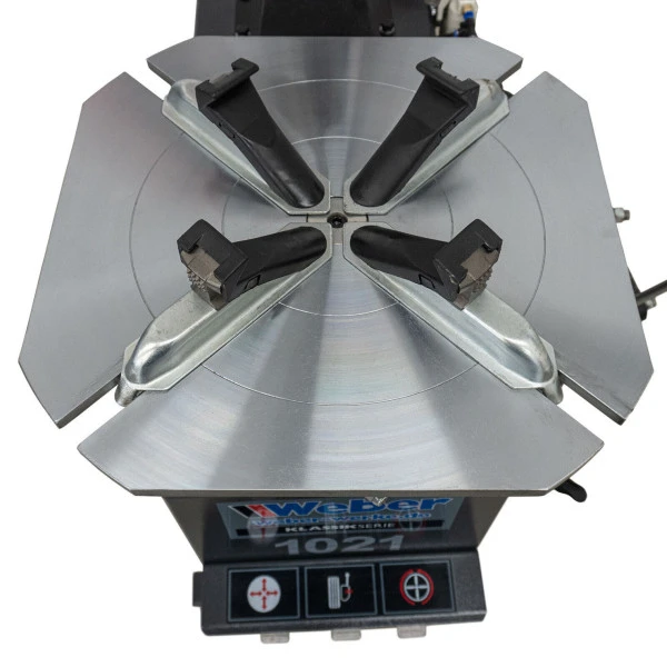 Met deze professionele bandendemonteermachine met hulparm worden banden van auto’s, bestelwagens en motoren snel gedemonteerd en gemonteerd. Een pneumatisch kantelbare montagekolom zorgt dat banden makkelijk worden ingelegd op de zelf centrerende spantafel. De machine wordt bediend met de drie voetpedalen aan de voorzijde. De rechts gemonteerde hulpmontage-arm wordt bediend met een hendel Een neerdruk-rol helpt de bandhiel achter de montagekop te drukken. De machine is voorzien van een excentrisch verstevigde montagekop en klemklauwen van hoogwaardig staal die zorgen een veilige klemming van de velg van binnen en buiten.